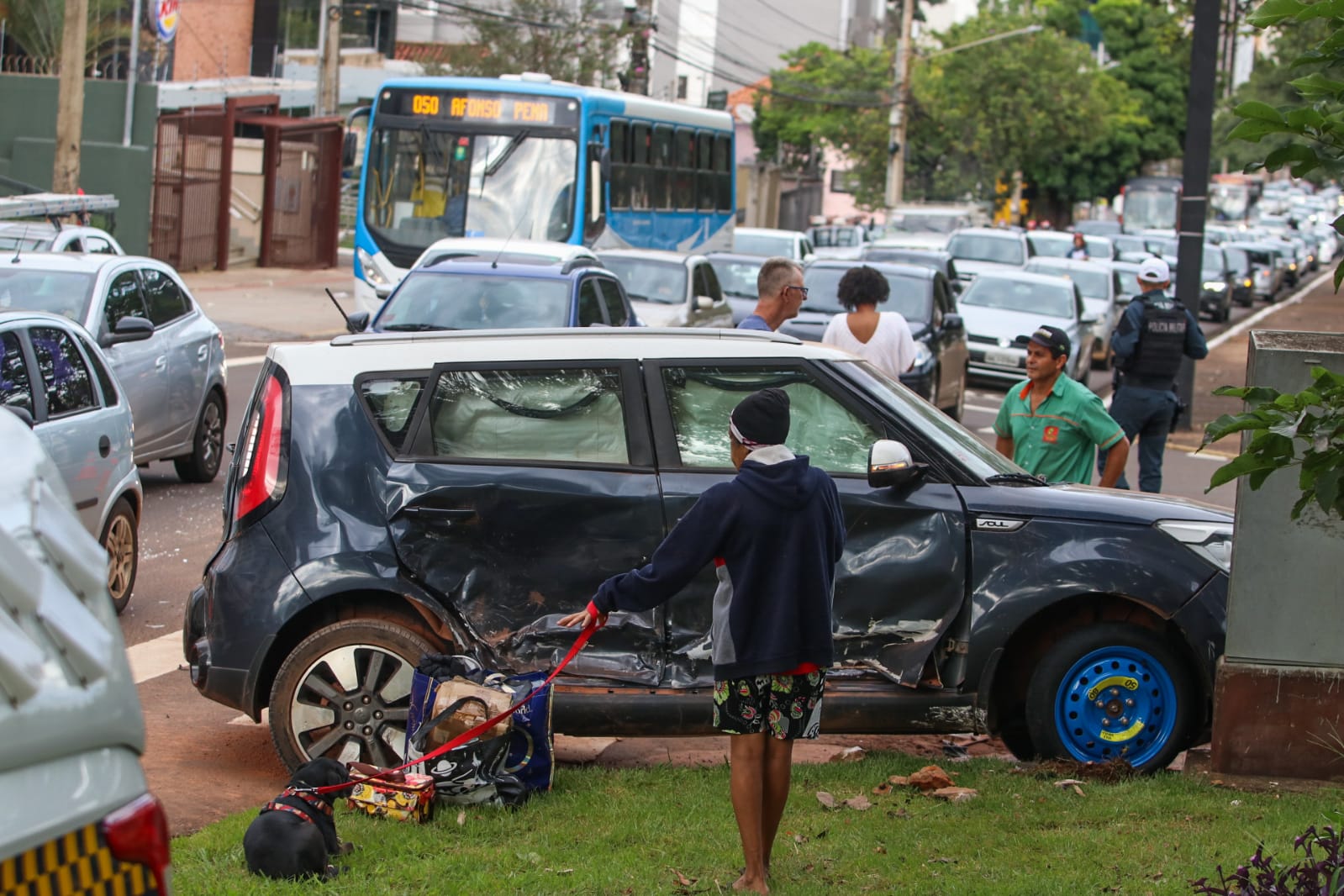 Acidente no cruzamento da Avenida Afonso Pena e Rua Padre João Crippa, no Centro de Campo Grande, provocou congestionamento que chega até a quadra do Camelódromo, abaixo da Avenida Calógeras. Um dos condutores precisou de socorro, sendo transportado por equipe do Samu (Serviço de Atendimento Móvel Urgente). A colisão aconteceu por volta das 5h, envolvendo condutores de Kia Soul e de Polo preto. A condutora do Kia Soul, uma arquiteta de 57 anos, que não quis se identificar, disse que estava na Avenida Afonso Pena, sentido centro-bairro, quando o carro dela foi atingido na porta do passageiro pelo outro veículo. Segundo ela, o condutor furou o sinal vermelho da Rua Padre João Crippa. Sem controle, o Kia Soul só não atravessou a outra faixa porque parou na caixa de energia instalada na esquina da avenida. O air bag foi acionado e nem ela, nem o cachorro, que também estava no carro, ficaram feridos. O outro condutor ficou desacordado e precisou de atendimento médico. A condutora diz que é de Jundiaí (SP), estava a passeio em Campo Grande e voltava para casa hoje. “Não conheço a cidade, por isso, vinha muito devagar, graças a Deus”. O outro motorista foi socorrido, mas não há informações para qual unidade de saúde foi levado. Logo após a colisão, o Polo preto foi retirado, mas logo o trânsito se tornou caótico, já que o guincho permanece no local para retirada do Kia Soul. Equipe do BPTran (Batalhão de Policiamento de Trânsito) está no local para controle do fluxo de veículo. Os cruzamentos estão liberados, permanecendo a fila de carros apenas na Avenida Afonso Pena. A fila de carros chega a 1 quilômetro na via.
