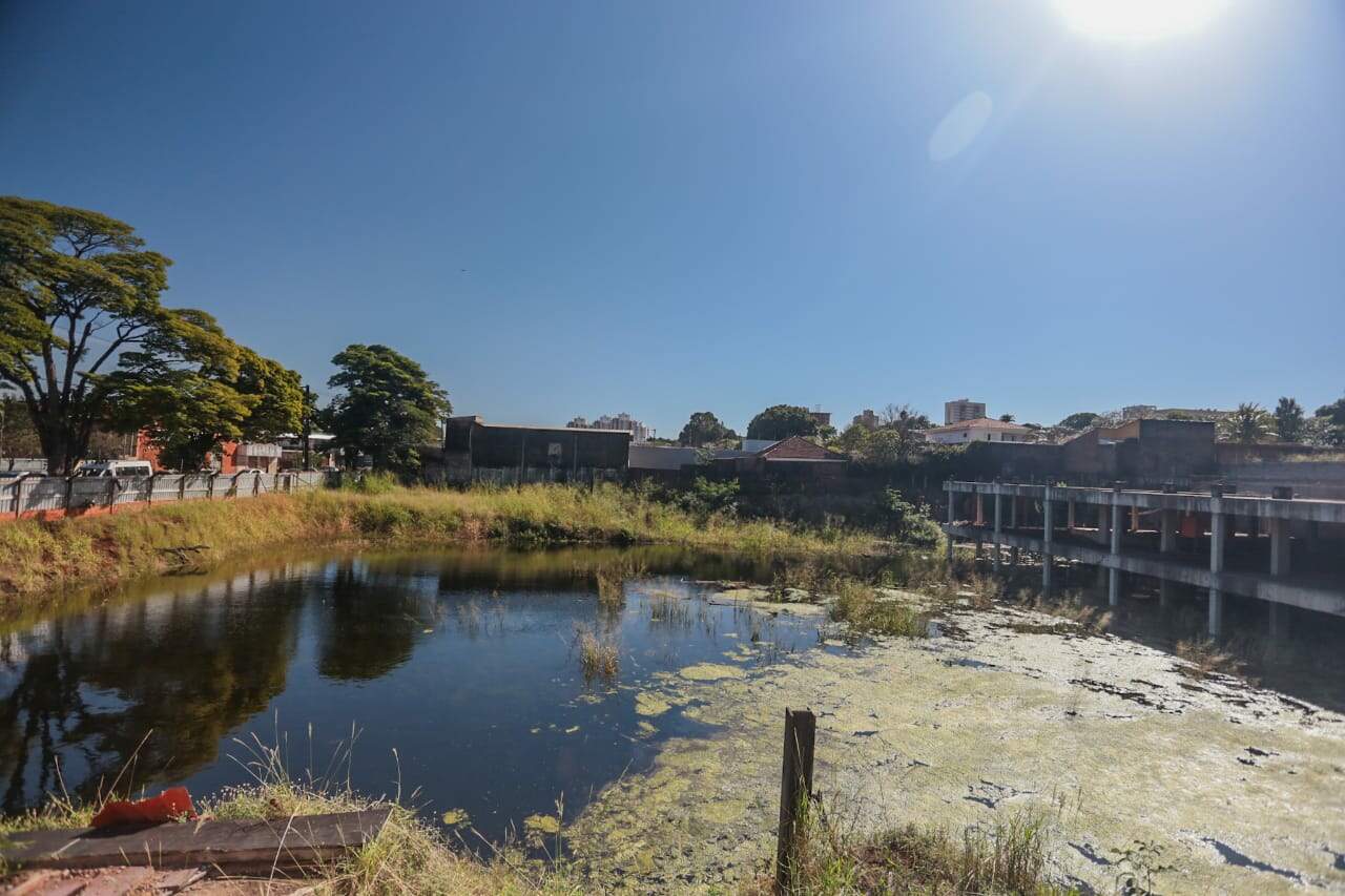 A quantidade de água acumulada é tanta que o terreno na Rua Amazonas, Centro de Campo Grande, se transformou em um tipo de lagoa. Nas imagens, é possível ver que há uma obra inacabada ao lado, além de mato alto. O local é protegido por cerca elétrica e placas de metal por toda sua extensão. Moradora da região, que prefere não ser identificada, conta que o terreno está abandonado pelos proprietários há pelo menos dois anos. "Na minha casa, não tinha mosquito assim antes de o terreno ficar desse jeito. Tinha um prédio construído aqui que foi demolido", relata a moradora. Ela conta que tem medo de pegar dengue devido à epidemia que o município enfrenta. Técnico em telefonia, de 33 anos, entrou em contato com o Campo Grande News pelo canal Direto das Ruas para mostrar a situação em que encontrou o terreno quando foi fazer um reparo no poste. Ele relata que já teve dengue e se preocupa com a gravidade da doença. Enquanto a reportagem apurava as informações, um funcionário da empresa Bellman, responsável pela obra, esteve no local e que não quis se identificar. Ele informou que a lagoa foi formada devido a uma bomba de água que queimou há três dias. A Semadur (Secretaria Municipal do Meio Ambiente e Gestão Urbana) afirmou, por nota, que o terreno será incluso na agenda de fiscalização da secretaria. A empresa Bellman ainda informou que tomou conhecimento do problema na manhã desta quarta-feira (24). Segundo a empresa, o acúmulo de água proveniente do lençol freático ocorreu devido a falha no sistema de bombas que recalcam a água para a rede fluvial. "De imediato acionamos nossos prestadores de serviços em Campo Grande para reparação do sistema de bombas e drenagem completa do terreno", ressalta a nota. A previsão é de que o problema seja sanado até o final do dia de hoje. Dengue – Campo Grande registrou 6.016 casos confirmados da doença durante os cinco primeiros meses do ano, segundo boletim epidemiológico divulgado pela SES (Secretaria Estadual de Saúde). No Estado, dos 79 municípios, 71 estão em alerta de alta incidência da doença. Ainda de acordo com o último boletim, 16 óbitos estão em investigação. Na Capital, 38 bairros estão em situação de alerta, de acordo com levantamento divulgado pela Sesau (Secretaria Municipal de Saúde). Direto das Ruas – A sugestão chegou pelo Direto das Ruas , o canal de interação dos leitores com o Campo Grande News . Quem tiver flagrantes, sugestões, notícias, áudios, fotos e vídeos pode colaborar no WhatsApp pelo número (67) 99669-9563. Clique aqui e envie agora uma sugestão. Para que sua imagem tenha mais qualidade, orientamos que fotos e vídeos sejam feitos com o celular na posição horizontal.