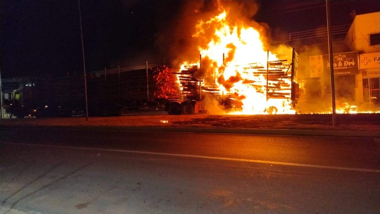 Caminhão carregado de eucalipto pegou fogo na manhã desta segunda-feira (27), na Avenida Júlio Maia, na região central de Água Clara, a 193 quilômetros de Campo Grande. As imagens chegaram ao Campo Grande News através do canal Direto das Ruas . Conforme apurado pela reportagem, o incêndio começou nas primeiras horas do dia e assustou quem passava pelo local, devido à intensidade das chamas que rapidamente tomaram conta do veículo. Equipes do Corpo de Bombeiros foram acionadas e contaram com o apoio de um caminhão-pipa para controlar o fogo. Até o momento, não há informações sobre vítimas nem sobre as causas do incêndio. Receba as principais notícias do Estado pelo Whats. Clique aqui para acessar o canal do Campo Grande News e siga nossas redes sociais .
