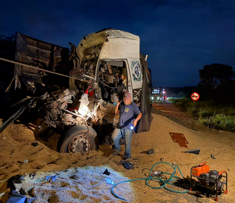 Acidente gravíssimo na MS-395, entre Bataguassu e Brasilândia, terminou com a morte do caminhoneiro Tarcio Adabi Sguarezi, de 61 anos. Ele não resistiu aos ferimentos e morreu no hospital após uma colisão envolvendo três carretas. Imagens mostram o cenário de destruição após o acidente. Segundo as informações do jornal Cenário MS, a sequência de fatos começou ainda na madrugada de domingo (1º), quando uma carreta carregada com soja pegou fogo no mesmo trecho da MS-395. Após o combate às chamas pelo Corpo de Bombeiros, o caminhão permaneceu imobilizado parcialmente sobre a pista, em um ponto onde não há acostamento. O veículo incendiado ficou no local durante todo o domingo. Já na madrugada desta segunda-feira, o motorista de uma carreta com placas de São Gabriel do Oeste não conseguiu desviar do caminhão queimado e colidiu violentamente contra a traseira. Ele ficou preso às ferragens, com a cabine completamente retorcida. Na sequência, uma terceira carreta, carregada com madeira, também se envolveu no acidente ao atingir de forma leve o segundo veículo. Nesse caso, o condutor não se feriu e houve apenas danos materiais. As equipes de resgate levaram cerca de três horas para retirar Tarcio das ferragens. Ele apresentava ferimentos graves e estava em estado de choque no momento do socorro. O caminhoneiro foi encaminhado inconsciente e em estado gravíssimo para a Santa Casa de Bataguassu, mas não resistiu e morreu após dar entrada no hospital. A carga de soja se espalhou completamente pela pista, exigindo a atuação da Polícia Militar Rodoviária de Batayporã e o apoio de um guincho de Bataguassu para a retirada dos destroços e limpeza da rodovia. Até as 5h de hoje, a MS-395 permanecia totalmente interditada, o que provocou congestionamento de cerca de cinco quilômetros nos dois sentidos. Receba as principais notícias do Estado pelo Whats. Clique aqui para acessar o canal do Campo Grande News e siga nossas redes sociais.