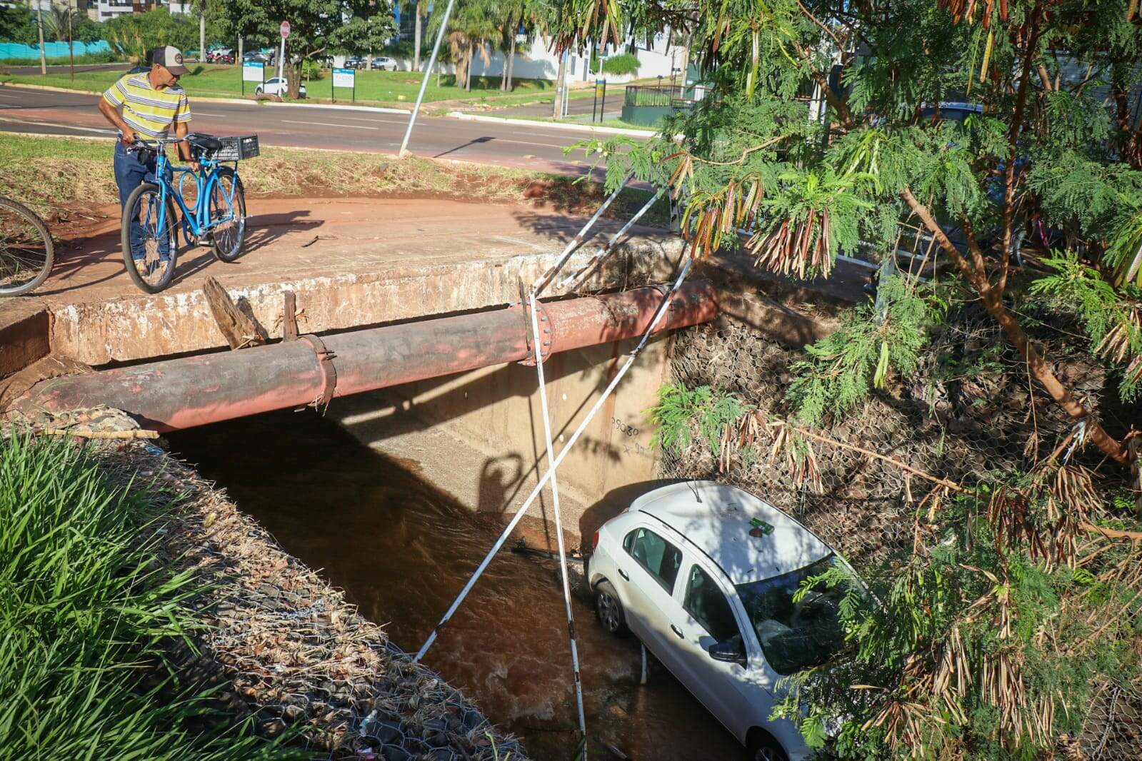 Carro com duas garrafas de cerveja foi encontrado caído dentro do Córrego Prosa, na manhã desta segunda-feira (16), no cruzamento das ruas Professor Luiz Alexandre de Oliveira com a Ivan Fernandes Pereira, no Bairro Vivendas do Bosque, em Campo Grande. Conforme apurado pela reportagem, o acidente aconteceu de sábado para domingo. A motorista, que não teve o nome divulgado, foi socorrida pelo Samu (Serviço de Atendimento Móvel de Urgência) para um hospital da cidade. A condutora dirigia o Volkswagen Gol, de cor branca, sentido Hospital da Cassems (Caixa de Assistência dos Servidores do Mato Grosso do Sul), quando perdeu o controle da direção, derrubou a grade de proteção do córrego e caiu na água. Há marcas de frenagem no asfalto. A parte da frente do automóvel ficou danificada. Nesta manhã, alguém que passava pela via viu o carro no córrego e acionou o Corpo de Bombeiros. Os militares encontraram duas garrafas de cerveja long neck, uma vazia e a outra cheia dentro do automóvel. O carro pertence a uma idosa de 70 anos, mas a informação no local era que outra pessoa dirigia no momento do acidente.