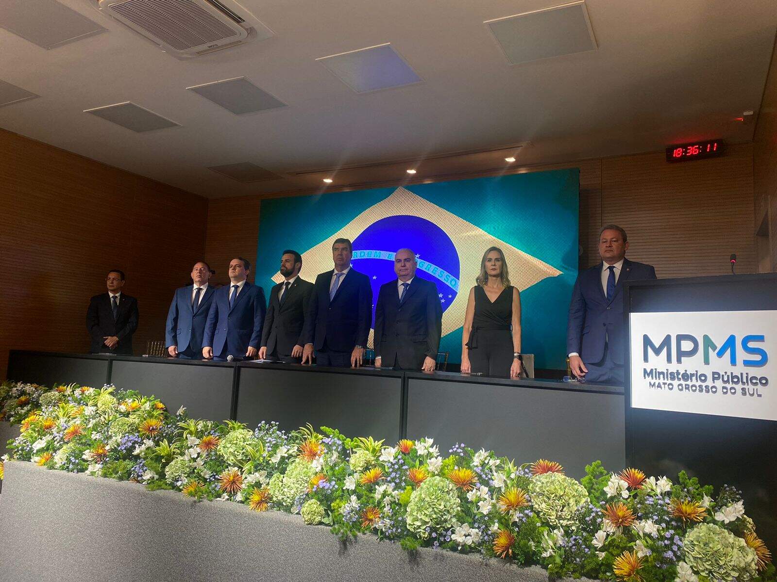 A ASMMP (Associação Sul-Mato-Grossense dos Membros do Ministério Público) realizou a solenidade de posse dos integrantes da nova Diretoria Executiva e do Conselho Fiscal eleitos pela classe para o biênio 2023/2025 na noite desta quinta-feira (16). A nova Diretoria Executiva será presidida pelo Promotor de Justiça Fabrício Secafen Mingati e terá como 1ª Vice-Presidente e 2º Vice-Presidente os Promotores de Justiça Clarissa Carlotto Torres e Milton Loureiro Filho. A cerimônia, realizada na Procuradoria-Geral de Justiça, foi presidida pelo Promotor de Justiça e Secretário-Geral da Associação Nacional dos Membros do Ministério Público, Romão Ávila Milhan Junior, Presidente da ASMMP nas gestões 2019/2021 e 2021/2023. Em seu pronunciamento Milhan Jr. agradeceu as autoridades presentes e afirma que agradece o tribunal, os colegas e integrantes do judiciário que tiveram diversas reuniões para saber como seria o trabalho do judiciário durante a pandemia de Covid-19. "Desejo sucesso para nova gestão e pode contar conosco para o trabalho em conjunto", pontuou. Empossado, Mingati, ressaltou em sua fala os princípios que guiarão a nova gestão, que será pautada pela transparência, independência, integração, trabalho, eficiência e principalmente o diálogo. "É imprescindível que possamos tomar como exemplo o trabalho das gerações que nos antecederam. Porque só estamos aqui em razão daquilo que foi construído lá atrás, pelos que nos antecederam. Seus acertos e erros forjaram a estrada pela qual, hoje, conseguimos trilhar na defesa da sociedade", explicou. O governador do Estado, Eduardo Riedel (PSDB), destacou que o alinhamento do diálogo em momentos críticos para o MS é fruto da construção da ASMMP, da atuação do MPMS e da postura colaborativa. “É o momento de agradecer pois o MPMS em várias ações é colaborativo, se coloca ativamente para levar uma missão em conjunto, com todos os Poderes, para fazer as reformas que o MS fez para gerar uma diferença substancial", concluiu.