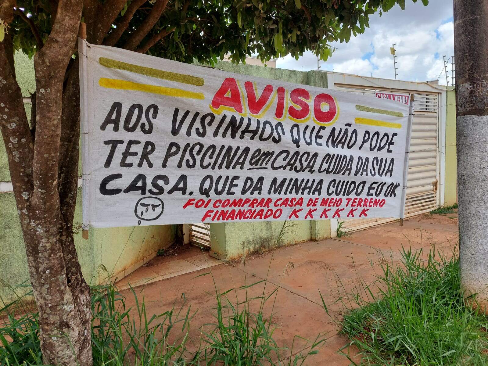 “E se reclamar mais, vou levar lá e jogar dentro da piscina”, é o que diz um proprietário que fez até faixa aos vizinhos depois de receber reclamação sobre sua piscina. Em um recado nada carinhoso colocado na Rua Assef Buainain, ele dá a entender que os vizinhos são invejosos e ao Lado B confirmou que essa realmente foi a intenção. “Aos visinhos que não pode ter piscina em casa, cuida da sua casa. Que da minha cuido eu ok. Foi comprar casa de meio terreno financiado k k k k k k” [sic], diz a faixa. Há pouco mais de uma semana, o recado apareceu e, sem querer se identificar, vizinhos alegaram que não sabiam sobre o motivo do recado. No Jardim Itatiaia, a casa possui dois textos em sua fachada, um dizendo que o local possui piscina e que está disponível para venda, enquanto o outro é o recado maior do que o anúncio. Se identificando como Paulo Silva, de 62 anos, o proprietário assumiu que a faixa foi paga por ele e que o recado já surtiu efeito, “calar a boca de todos”. Explicando sobre o que aconteceu, ele detalhou que uma suposta ligação da Vigilância Sanitária sobre a piscina foi o motivo. “Eu tenho piscina em casa, porém ela está para venda. Foi eu colocar que a casa tem piscina que me ligaram dizendo ser da Vigilância Sanitária. Marquei para olhar, mas ninguém apareceu e eu toda semana estou na casa jogando cloro e limpando a piscina”, narra Paulo. Devido à suposta equipe não ter aparecido, a conclusão do comerciante foi de que algum vizinho se incomodou e entrou em contato. “Com certeza é coisa desses vizinhos que compraram essas casas de meio terreno e não podem ter piscina, nem tem dinheiro para comprar. A minha faixa é para eles”. Com o contato da reportagem, Paulo ainda comentou que acredita que tudo ocorreu por inveja e que na próxima semana irá retirar a faixa, já que o efeito foi conquistado. Além de entrar em contato com o proprietário, tentamos conversar com os vizinhos, mas não quiseram se identificar e outros não chegaram a nos atender. Disseram apenas que nunca tiveram problemas com o dono da casa com piscina e que não sabiam o motivo da faixa. Acompanhe o Lado B no Instagram @ladobcgoficial , Facebook e Twitter . Tem pauta para sugerir? Mande nas redes sociais ou no Direto das Ruas através do WhatsApp (67) 99669-9563 (chame aqui) .