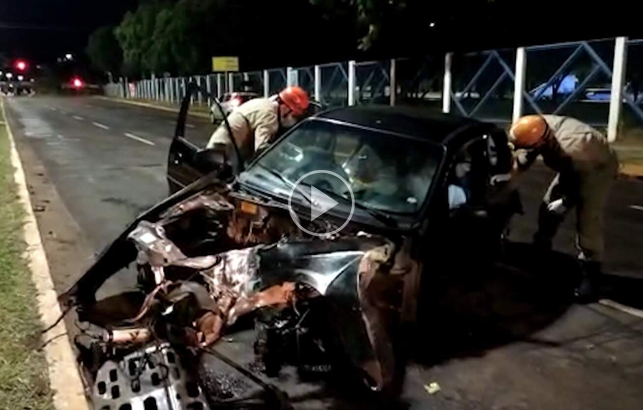 Carro, de cor preta, ficou destruído após colidir contra grade da UFMS (Universidade Federal de Mato Grosso do Sul), na madrugada desta quinta-feira (23), na Avenida Costa e Silva, em Campo Grande. O motorista, que não teve o nome divulgado, ficou ferido e foi socorrido pelo Corpo de Bombeiros à Santa Casa. Veja, acima, o vídeo. Conforme apurado pela reportagem, o condutor seguia sentido centro/bairro e tinha como passageira uma mulher, de 37 anos, quando perdeu o controle da direção, subiu na calçada, atingiu uma das pilastras de concreto e derrubou a grade da universidade. O condutor foi socorrido e a passageira não ficou ferida. A batida foi tão forte que o motor se desprendeu do carro. Calota, vidro, escapamento e outras peças do automóvel também ficaram espalhadas pela via. O veículo ficou com a frente totalmente destruída. Além dos bombeiros, atenderam a ocorrência policiais do BPMTran (Batalhão de Polícia Militar de Trânsito). Direto das Ruas – A imagem chegou pelo Direto das Ruas, o canal de interação dos leitores com o Campo Grande News . Quem tiver flagrantes, sugestões, notícias, áudios, fotos e vídeos pode colaborar no WhatsApp pelo número (67) 99669-9563. Clique aqui e envie agora uma sugestão . Para que sua imagem tenha mais qualidade, orientamos que fotos e vídeos sejam feitos com o celular na posição horizontal.